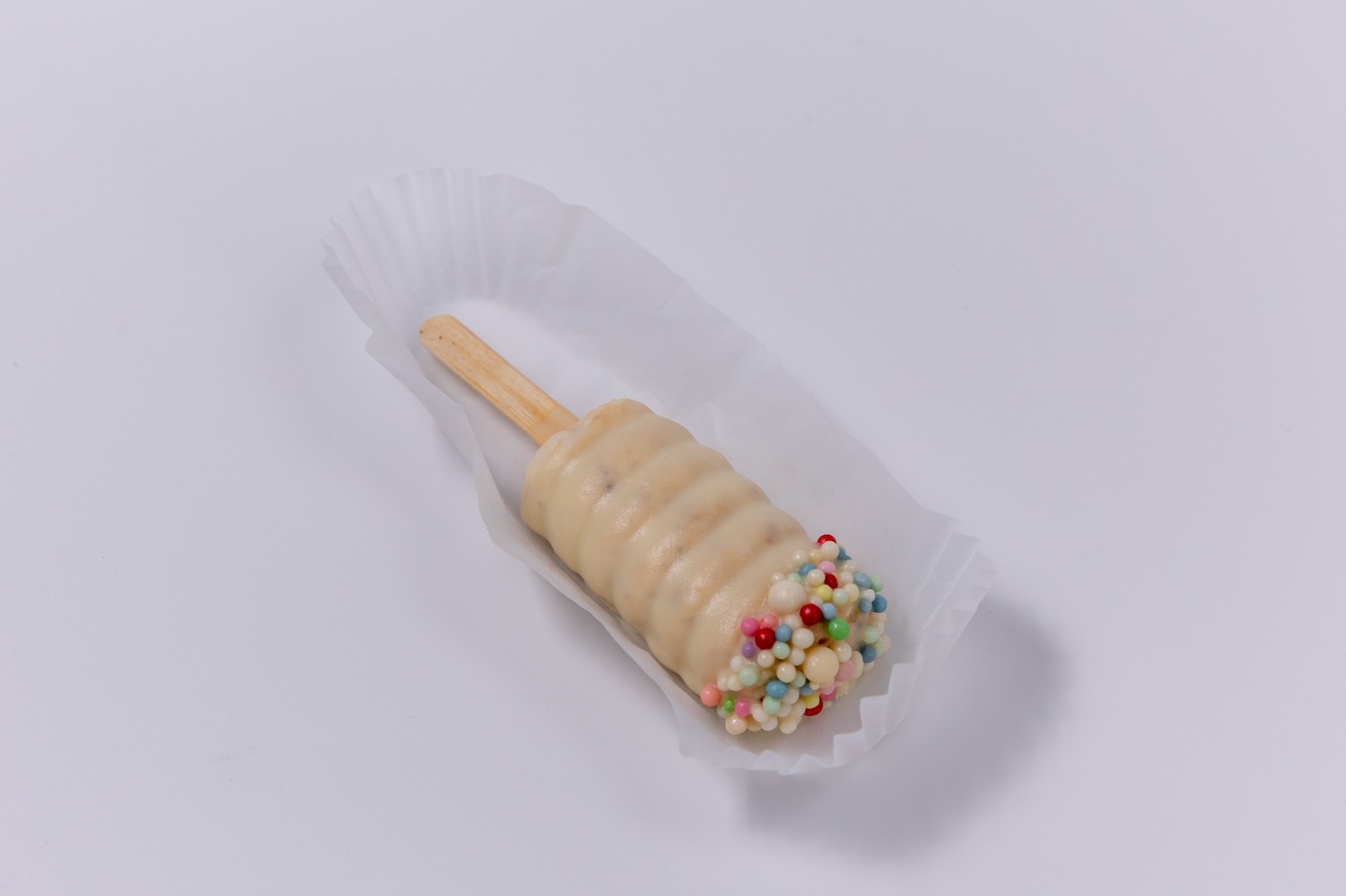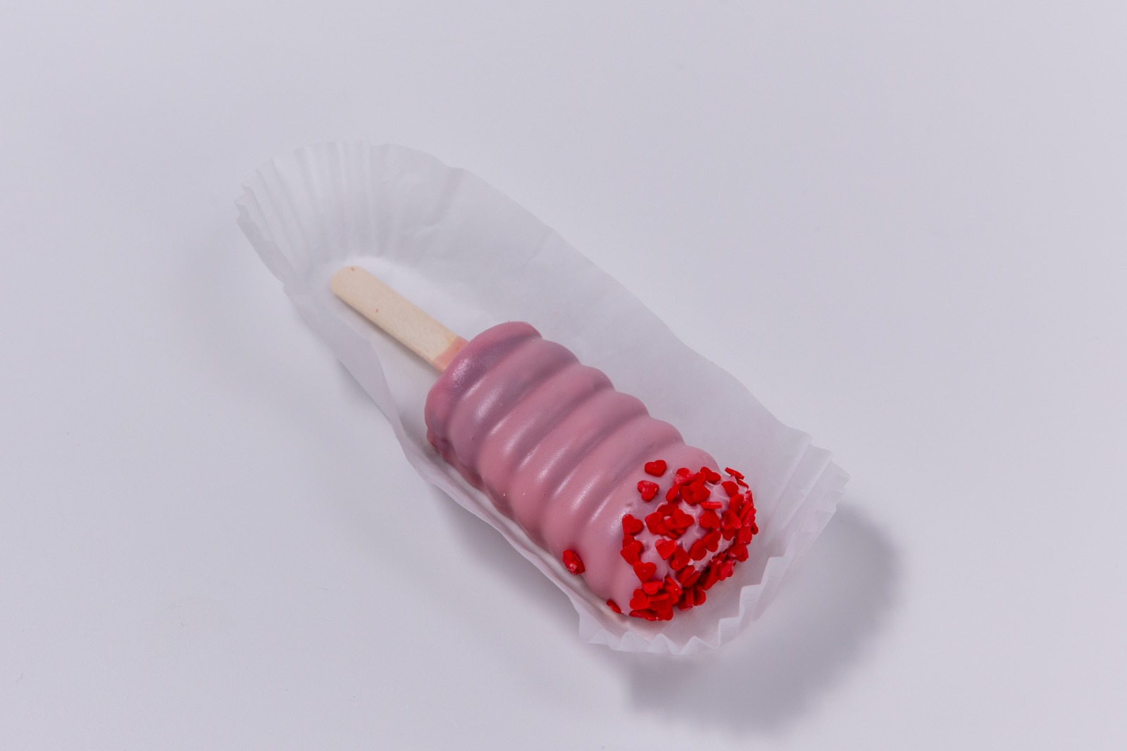 Десерт на палочке из ванильного бисквита, шоколадно-сливочного крема с добавлением дроблёного миндаля.