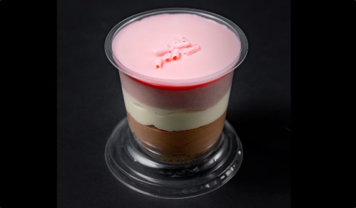 Нежный десерт из трехслойного мусса с разными вкусами: клубника, белый и молочный шоколад на хрустящей основе из штрейзеля.