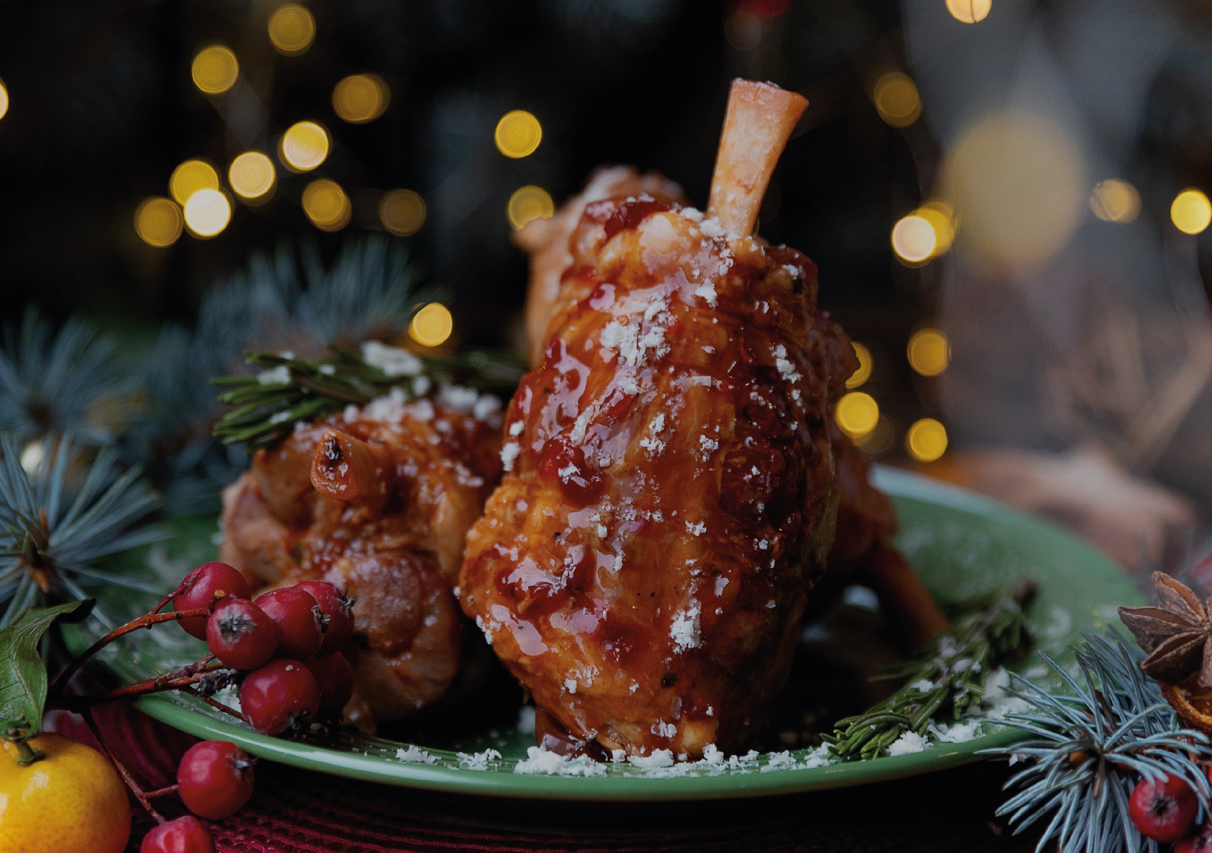 Оригинальное горячее блюдо для праздничного стола - ломтики нежной свиной рульки, запеченые в пикантном соусе.