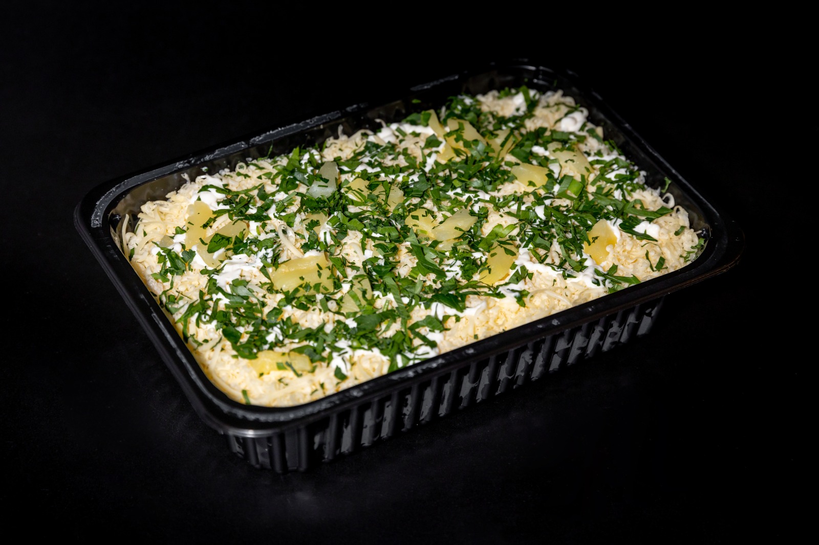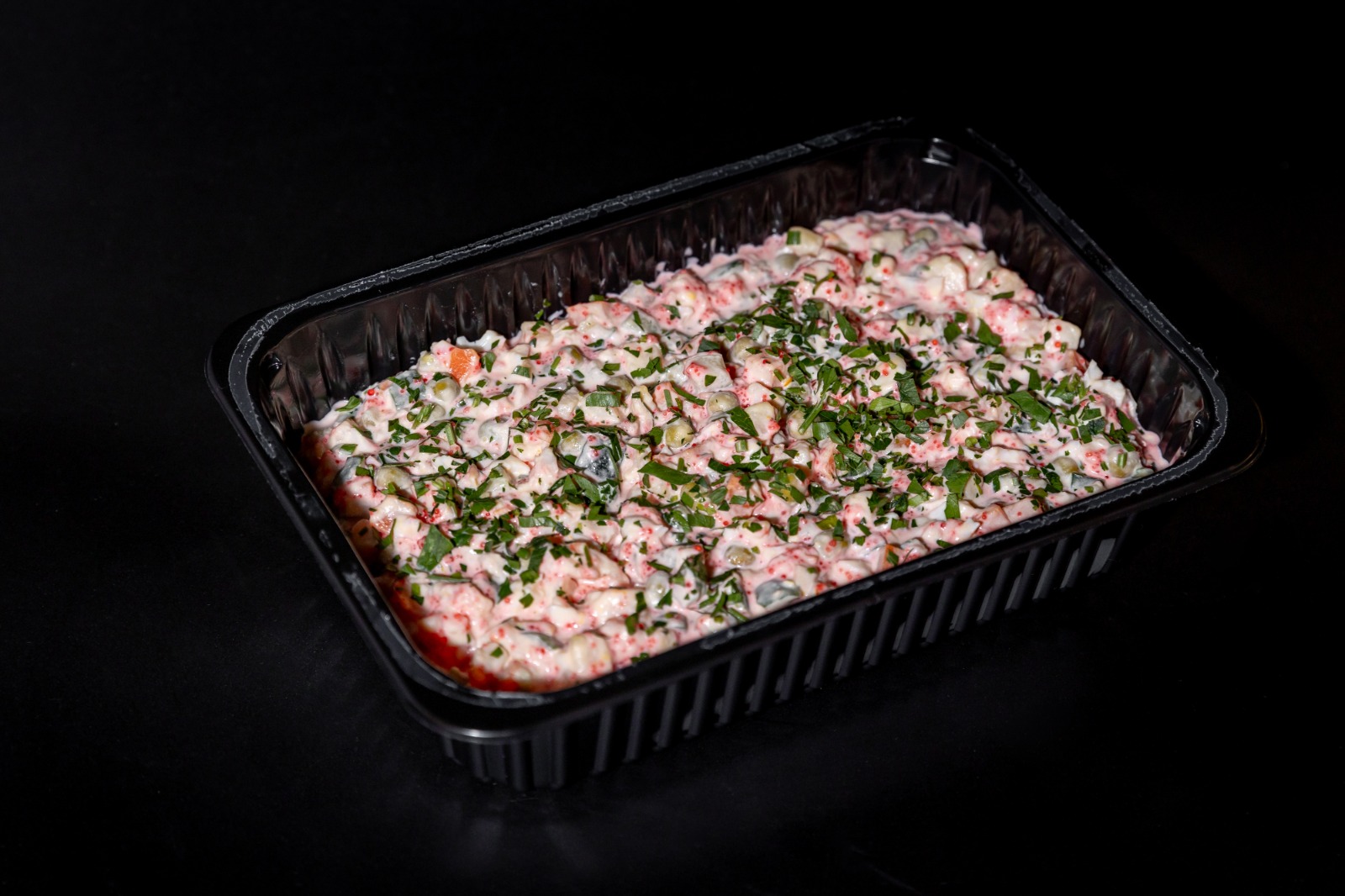 Премиальная версия классического "Оливье" с креветками и икрой тобико. Не просто салат, а праздник вкуса!